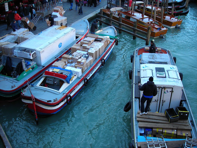 En Venecia no hay coches, ni motos y apenas se ven bicicletas. Todo, absolutamente todo pasa por transporte fluvial. Y cuando digo todo me refiero a que no hay «camión de la basura» sino «vaporetto de la basura», ni camiones frigoríficos» sino «vaporetto frigorífico», fueron algunas de las cosas que más me llamaron la atención.