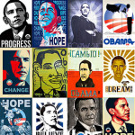 Iconografía: La industria del diseño se puso a trabajar duro y consiguió crear una campaña de imagen sin precedentes. Bajo el lema «Yes We Can» se le quiso comparar a otros míticos políticos y líderes de masas (Che Guevara, Martin Luther King…). Se hicieron todo tipo de reproducciones de merchandaising: chapas, camisetas, banderas, pósters… y las ventas de estos productos se dispararon sin que ningún otro líder político haya podido vender tal cantidad de material.